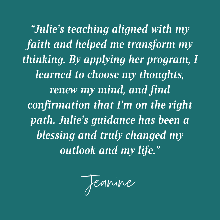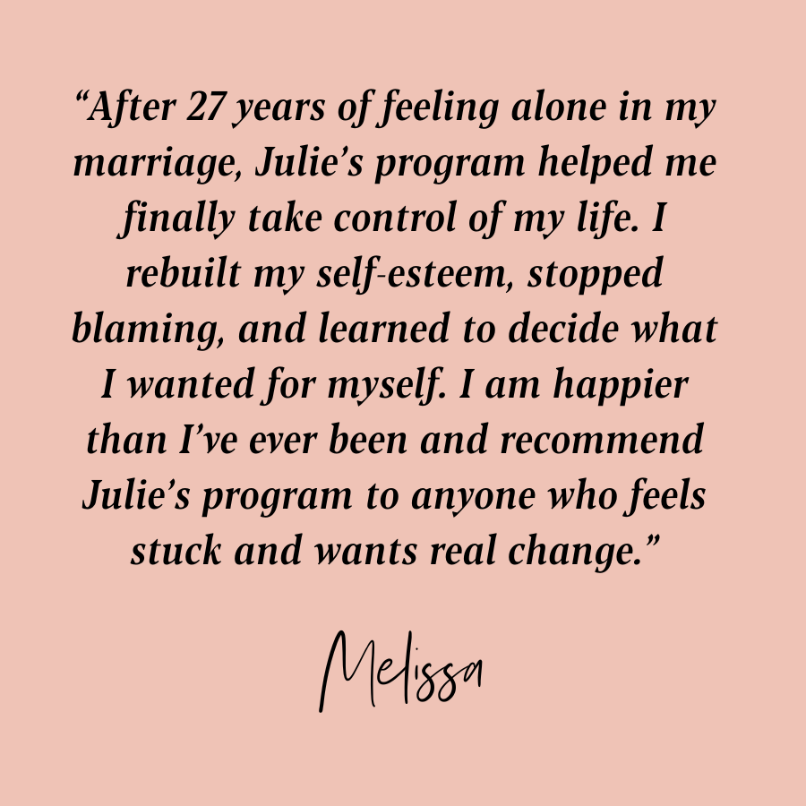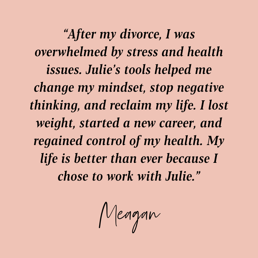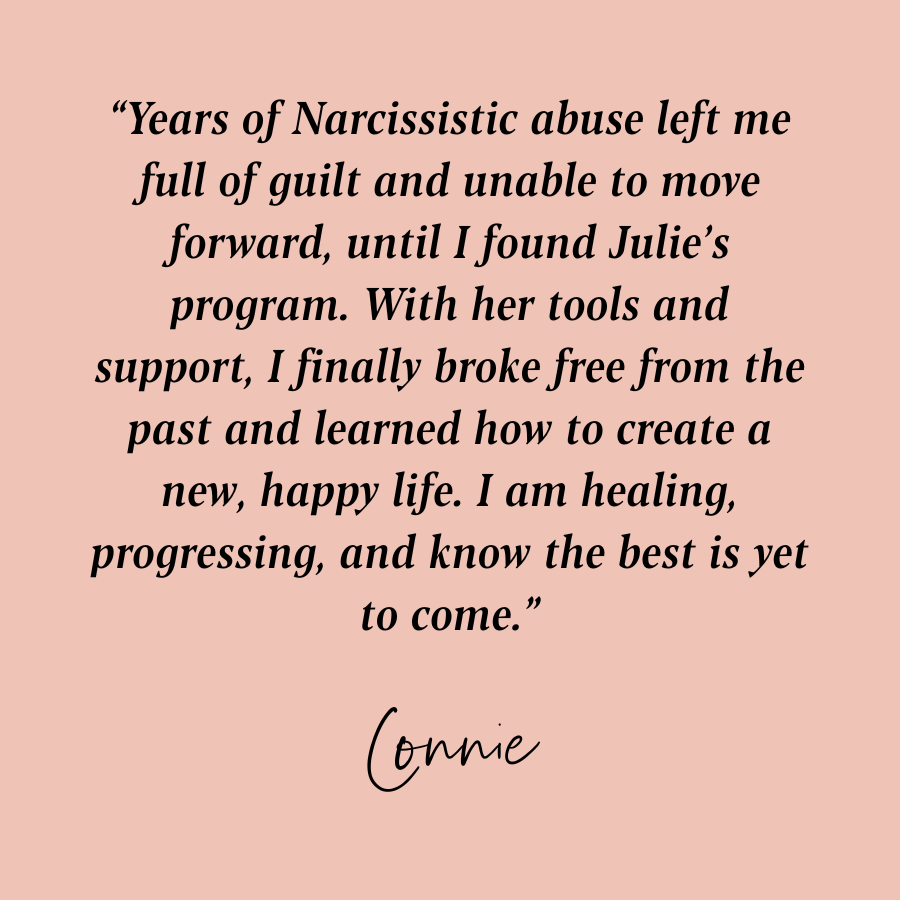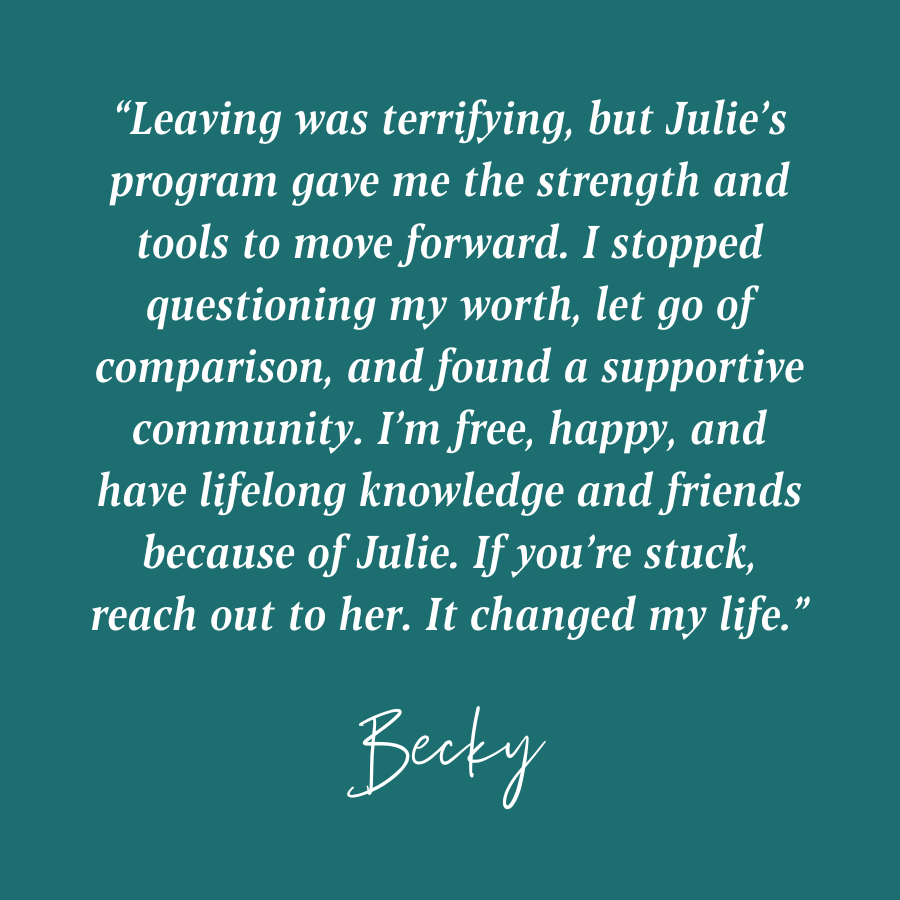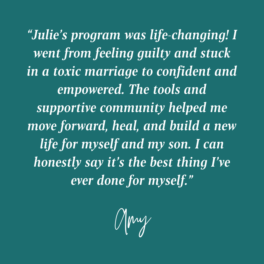 "I was feeling stuck and unable to move on in my life. I had self-doubt and couldn't understand how I got there. After enrolling in Julie's program I finally found myself on a journey of healing and self-empowerment. I am now the happiest I have ever been."