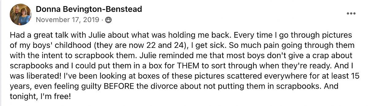 "I was a stay-at-home mother of 5 kids who had never supported herself. Two years post-divorce I have a great job that I love, starting a master's degree, and am shopping for my own home. I am able to set boundaries with my ex and maintain an amiable relationship as we raise our kids together. I feel more alive than I have in years, and I look forward to my future. Julie's program works! I am living my authentic life as I strive towards becoming my best self."
